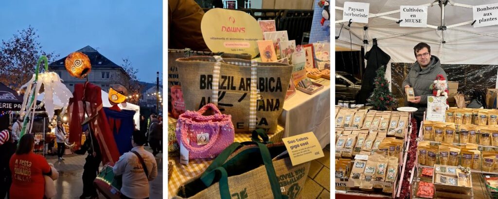 C’est L’Arche de Villerupt qui a accueilli le Marché d’hiver ce 20 décembre. Au programme: spectacles, producteurs locaux et actions solidaires. «Nous travaillons avec une dizaine de producteurs du territoire, qui sont présents à chacun de ces marchés», explique Ophélie Barat, responsable du développement territorial pour le NEST. À cela s’ajoutent des associations locales (dont l’Association de protection des animaux de Villerupt – APAV) et une orientation seconde main. «Cette année, nous avons ouvert l’invitation aux exposants d’autres côtés de la frontière, un travail que j’ai amorcé en vue de notre marché de printemps qui se déroulera à Esch-sur-Alzette». Le projet Interreg ACTE – Avec les Citoyens pour la Transition Écologique proposait des vêtements, jeux pour enfants et décorations de Noël en gratuité, et une exposante scénographique belge était également présente.